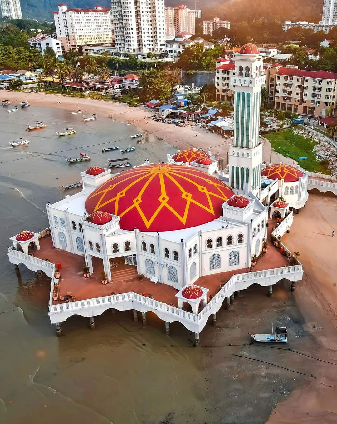 The Penang Floating Mosque, also known as Masjid Terapung Tanjung Bungah, is a captivating architectural marvel near George Town, Penang, Malaysia. Situated just 100 meters from the coast, it continues to draw local and international tourists with its distinctive design combining local craftsmanship and Turkish influences. The mosque, open to the public since 2007, gives the illusion of floating when the tide is high, as it is built on stilts due to limited land availability. With a capacity of 1,500 worshippers, Masjid Terapung Tanjung Bungah serves as a place of worship for the local Muslim community while also offering facilities for nearby residents, including those who were relocated after the tsunami. Its architectural features include an aerodynamically-shaped dome, a seven-story tall minaret adorned with teak wood carvings, and Indonesian calligraphy art. The mosque's vibrant mosaic, colourful ceramic flooring, and sunflower-patterned walls create a visually appealing and unique ambience. The surrounding area is also known for its seafood restaurants and beautiful beach, making it a popular destination for visitors. and beautiful beach, making it a popular destination for visitors.